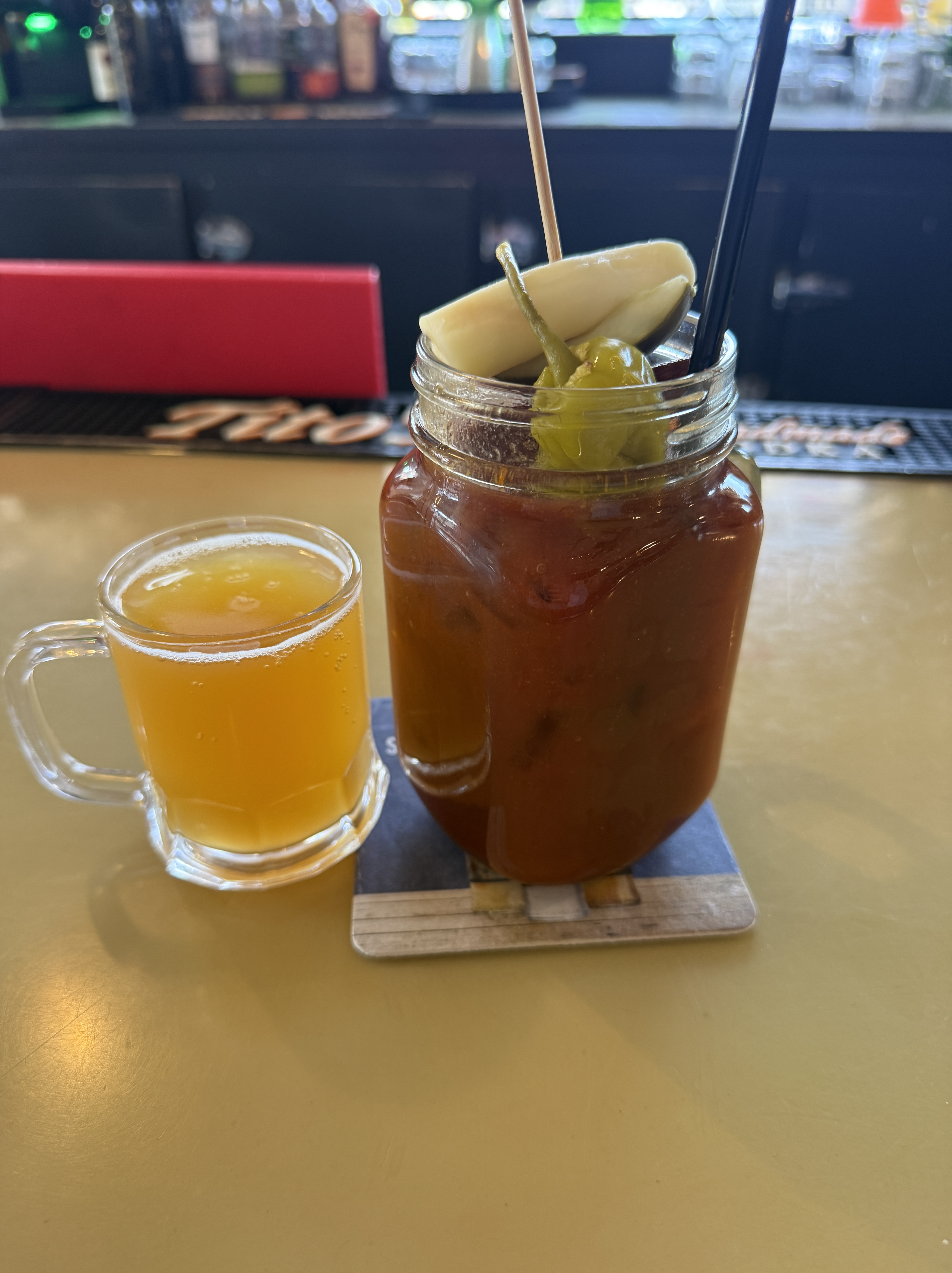 The Bloody arrived in a little mason jar (always a solid Wisconsin touch) and was garnished with a beef stick, a chunk of cream cheese, a pickle spear, and a pepperoncini. It also came with a chaser — your choice of any of their beers on tap — which is always a win in my book.