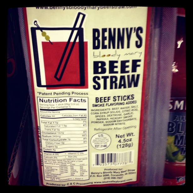 Last weekend, when I was shopping at Ray’s Wine & Spirits, I came across Benny’s Bloody Mary Beef Straws. Yes, that’s right, a beef stick hollowed out into a glass-to-mouth transportation device. The straws retail for $7.99/package of 5 at Ray’s; you can also buy them online via the company’s website.