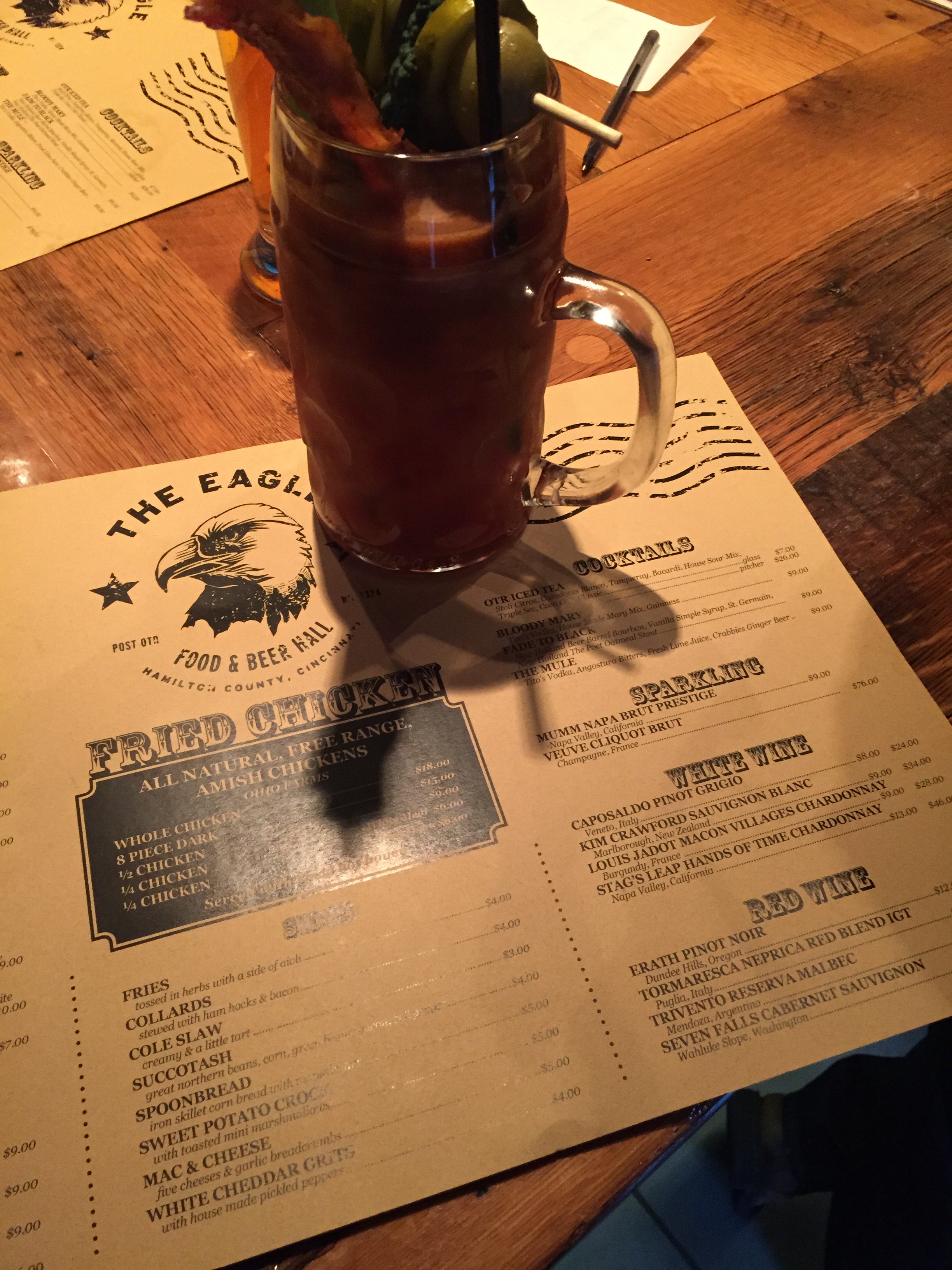 After scouring several “Best of” lists and cross-referencing by proximity to my hotel, I had narrowed down my list to about 3-4 places. Two of them only served their “special” Bloody Mary on Saturdays and Sundays during a certain time and one place was closed for renovation…which led me to place all my eggs in the basket of The Eagle OTR.