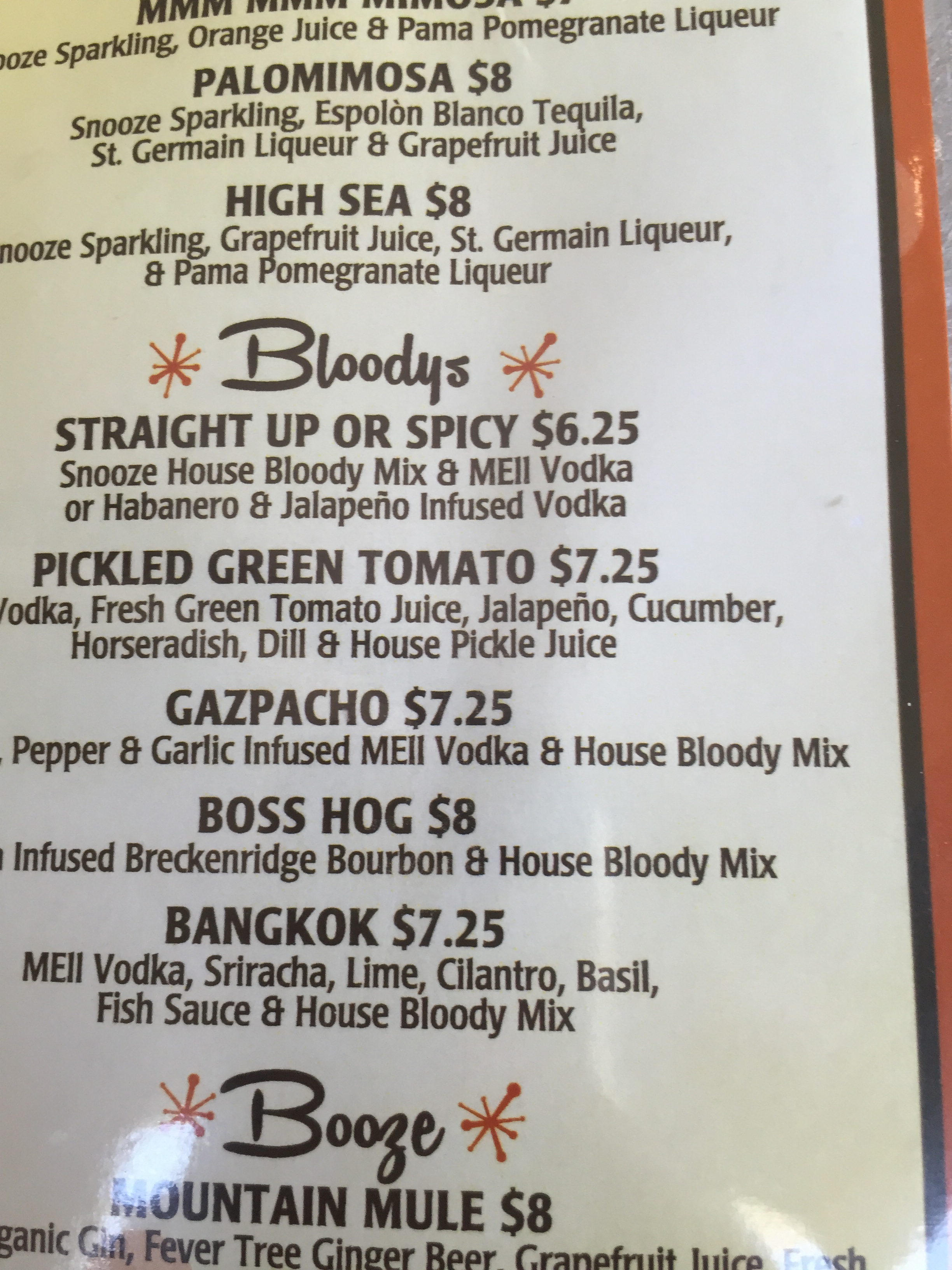 Snooze has a Bloody Mary menu consisting of five unique bloodies: