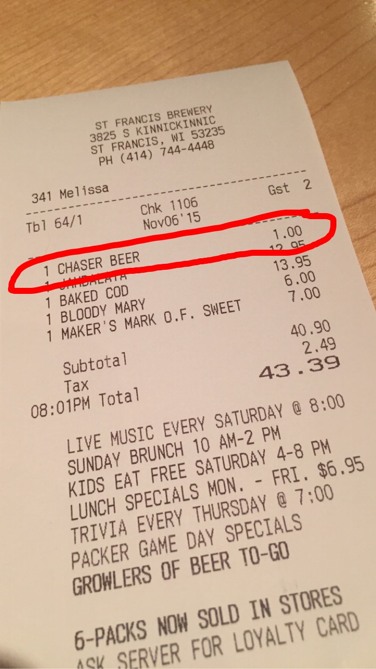 11/16/15 Update: See the comments below! St. Francis Brewery took our review to heart and is eliminating the $1 chaser charge! Good news for all the Bloody Mary lovers out there!