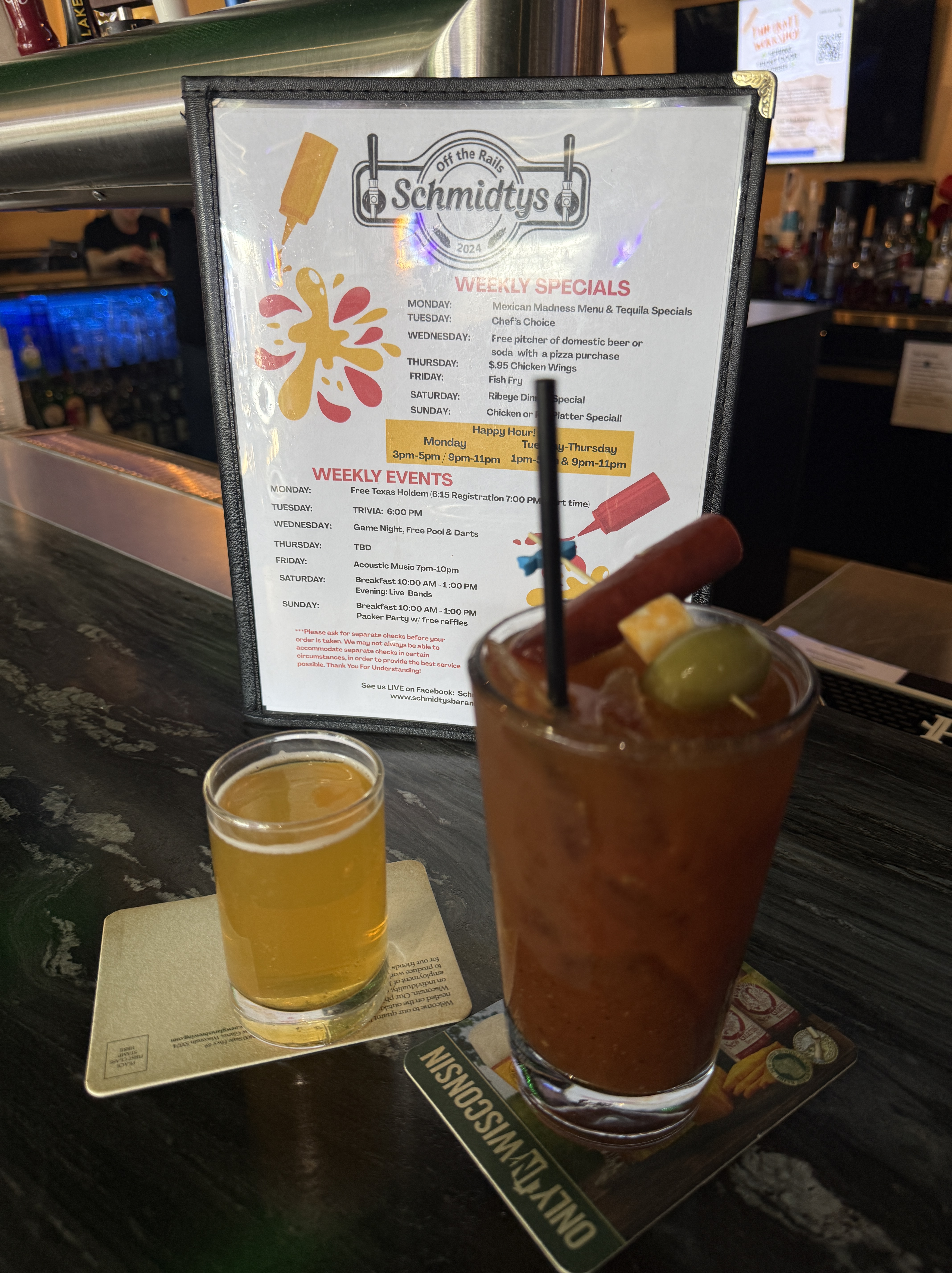 If you’re in the Brookfield/Menomonee Falls area and looking for a lively bar with music and events, Schmidtys Off the Rail could be worth a stop. The Bloody Mary may not steal the spotlight, but it’s a solid companion for a casual afternoon.