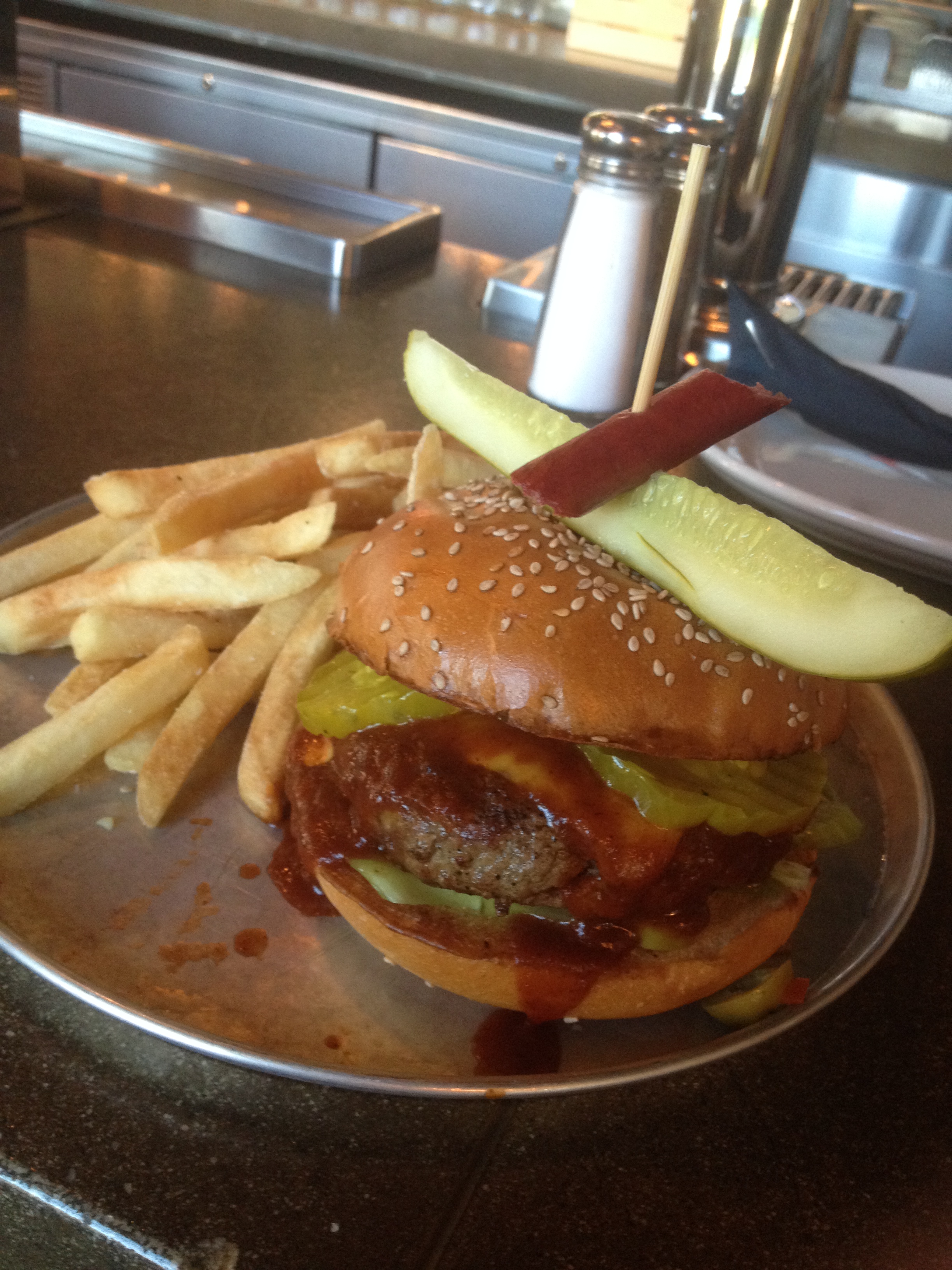 We have to admit, we were a little disappointed. While not too gamey-tasting (like I was expecting), the patty seemed small and quite dry. There was definitely more bun than meat. The best part about this was the garnish, but we would have rather had that on top of a real bloody mary, rather than this burger–especially for the price tag.