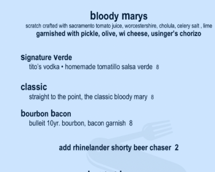 Spices/Flavor: They offer a Bloody Mary, Maria or Caesar and you can add infused vodka for an upcharge