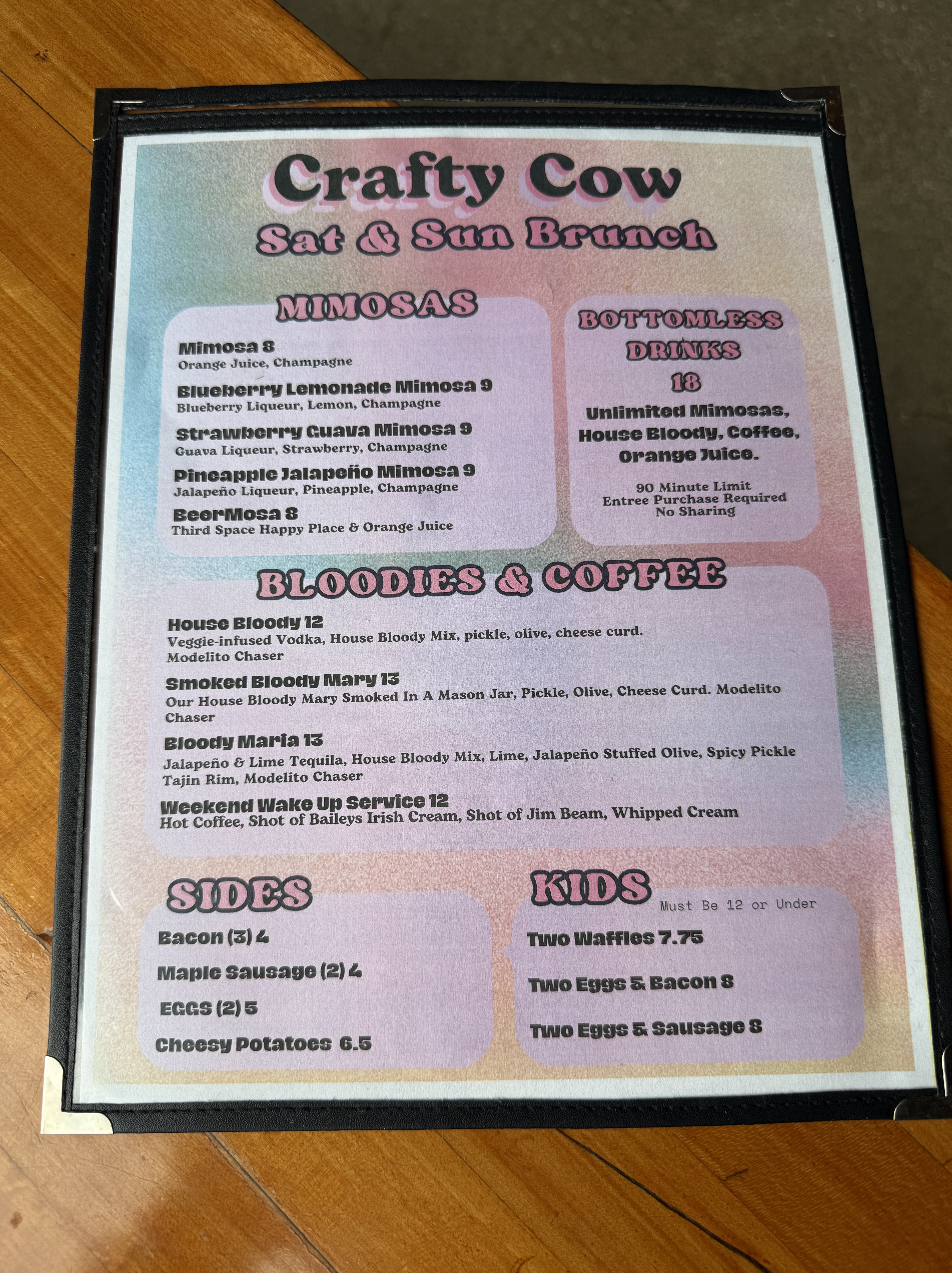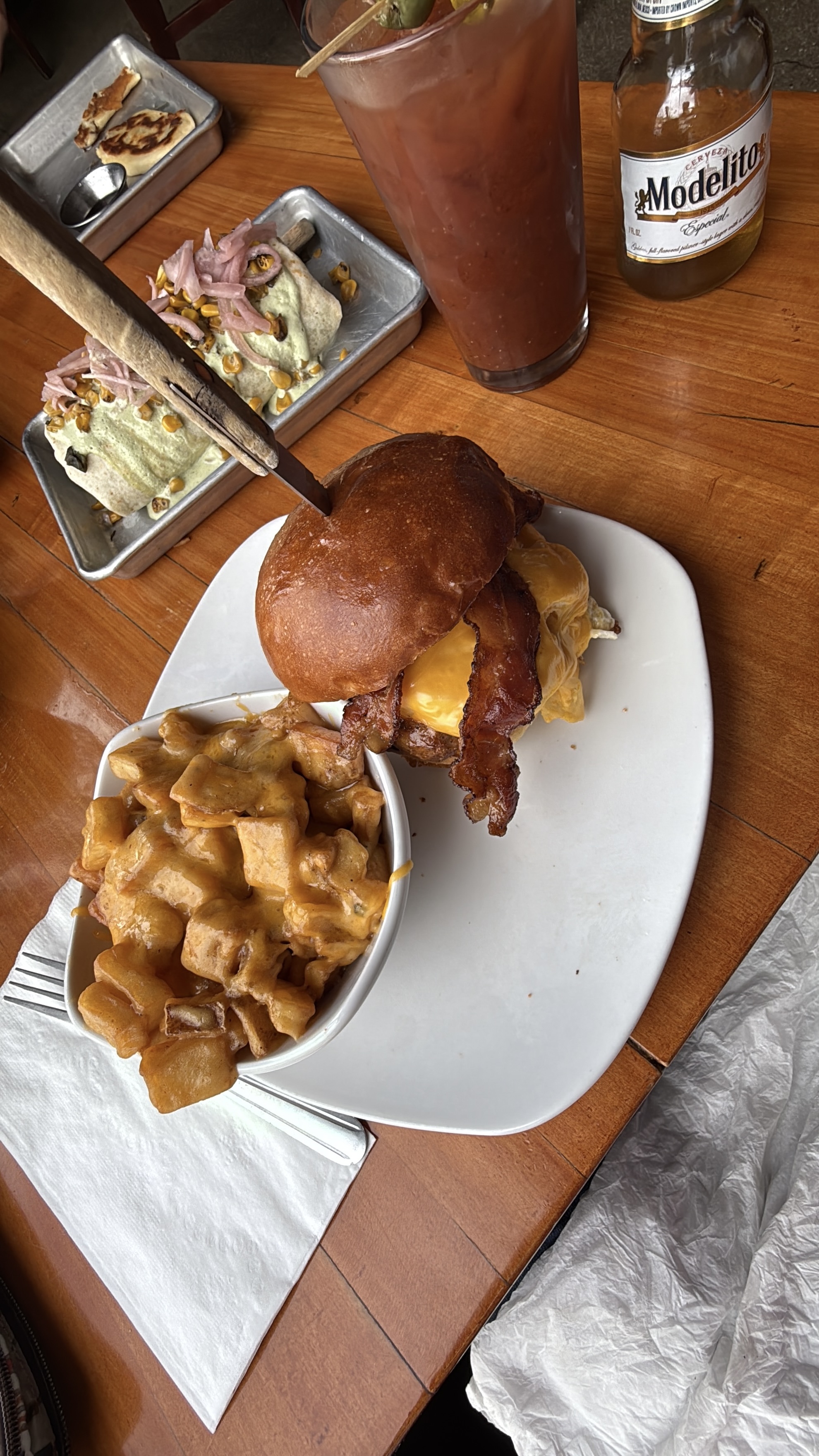 A place like this prides itself on its craft cocktails, so we were really hoping the Bloody Mary would be something special. Jimmy Luv’s and modest fixin’s left us wanting more. You get a ton of food (we had to take half ours home) for a great price, but I would have paid more for a great Bloody Mary. They should think about creating a house mix and infusing their own vodka, or at the very least adding so flair in the fixin’s.