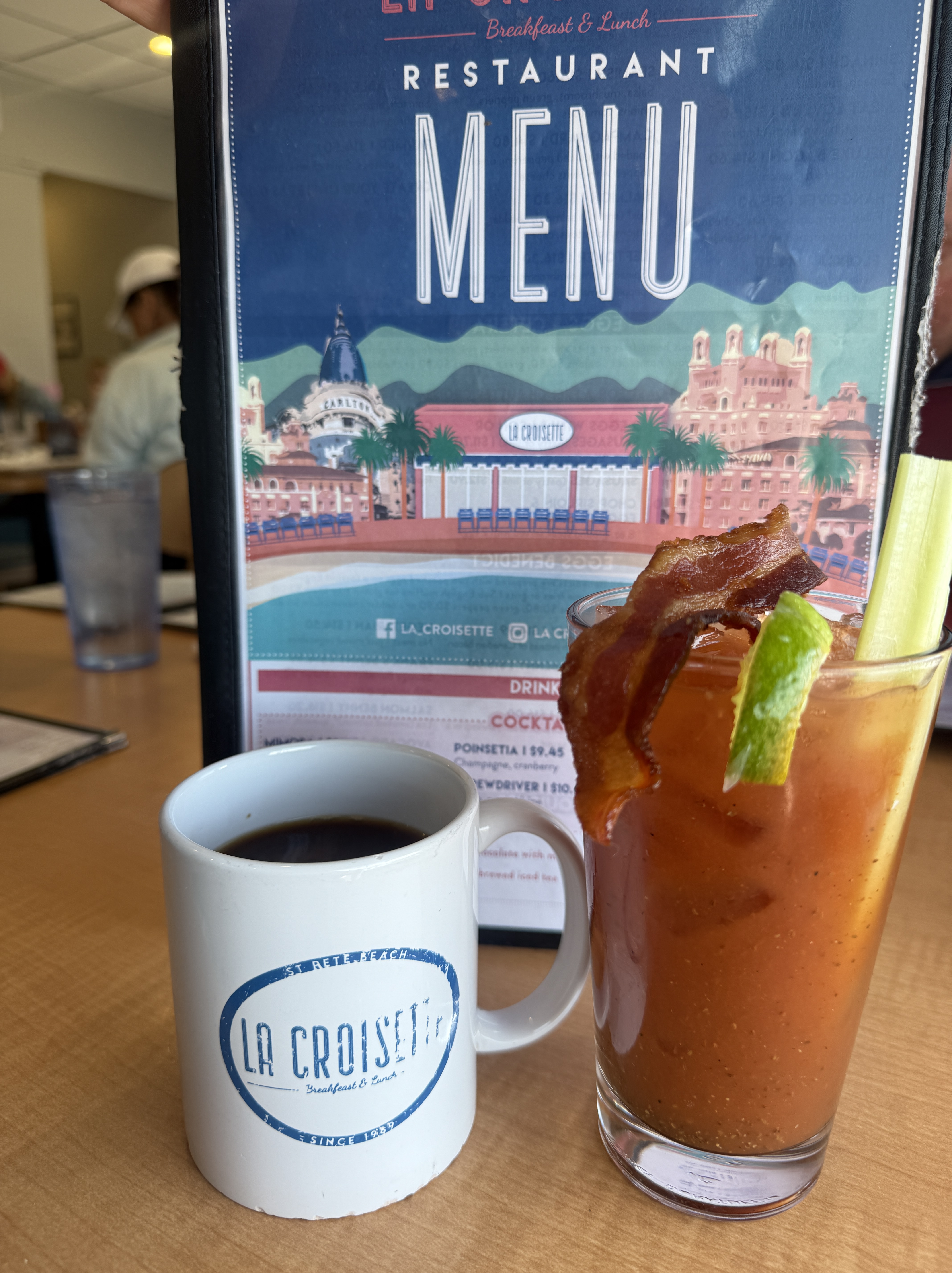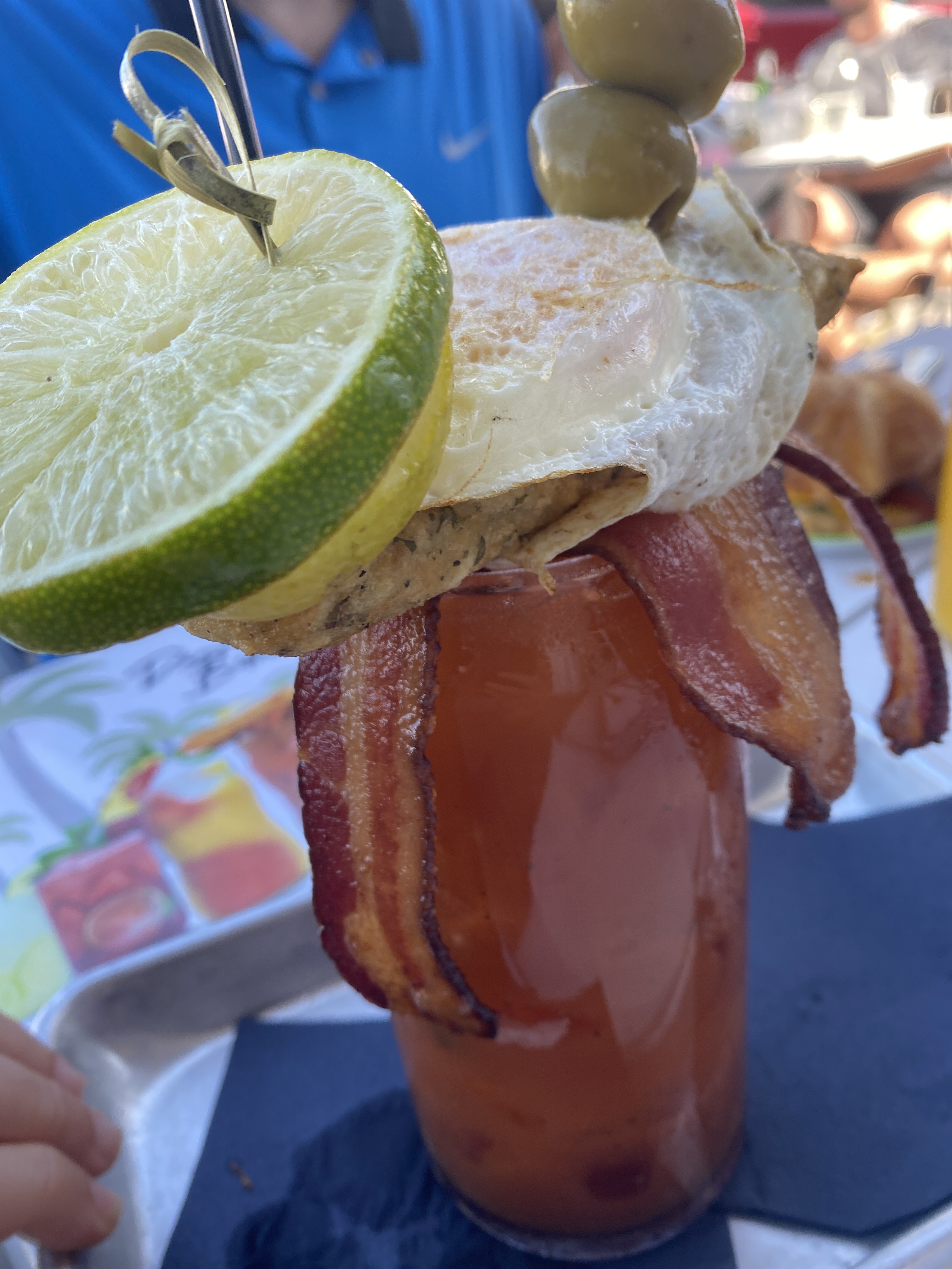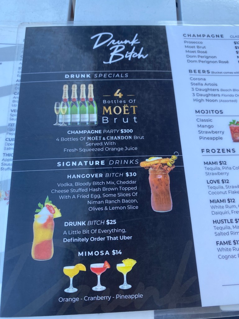 This Bloody is made with Zing Zang mix and comes garnished with a jumbo shrimp, celery, olives, a wedge of lime, and supposedly a beef jerky straw. I didn’t get the jerky straw this time (a personal disappointment because those are amazing), but the carrot and celery were a nice substitute. The salted rim was a definite plus. Flavor-wise, it was solid, perfectly balanced, and refreshing under the Miami sun.